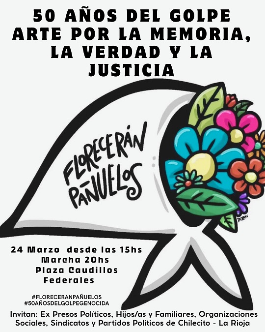 23/03/2026 | A 50 años del último golpe de Estado en Argentina, organizaciones sociales, políticas y de derechos humanos convocan a una jornada de memoria, arte y reflexión en la ciudad de Chilecito. Bajo la consigna “Florecerán pañuelos”, la actividad busca mantener viva la memoria colectiva y reafirmar el compromiso con la verdad y la justicia.